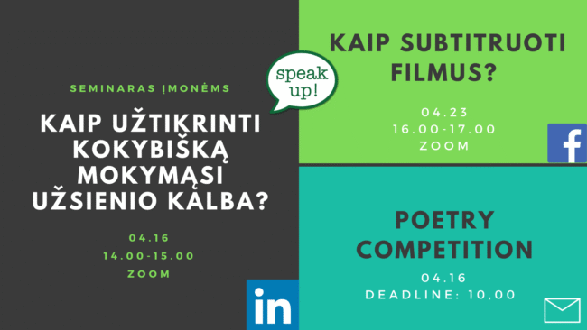 „Speak Up“ kalbų mokykla kiekvieną mėnesį skelbia naujus seminarus ir konkursus įmonėms bei savo linkedin, facebook in instagram paskyrų sekėjams.