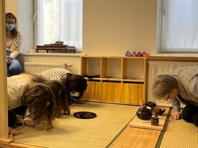 Pasibaigus seminarui vaišinomės tortu ir bendravome su tiek matytais, tiek naujais mokytojais-kolegomis. Galiausiai stebėjome japoniškos arbatos ceremoniją, o kelios mūsų mokytojos joje ir dalyvavo! Ceremonijos prasmė yra akimirkos pajautimas, erdvė draugystei ir pagarba vienas kitam, visa tai puikiai vainikavo GRUPO renginį ir atspindėjo jo esmę. Nustebsite sužinoję, kad tapti arbatos ceremonijos meistru užtrunka metų metus ir taip pasiekti nėra paprasta. Na, o išsėdėti net ir sutrumpintą ceremonijos versiją nėra taip fiziškai lengva, kaip gali pasirodyti!
